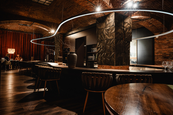 Poté jde přes šatnu dolů do sklepení, kde začíná druhá kapitola. Tady je situovaný i private dinning room, určený pro soukromou skupinu od 5 lidí, jehož dominantou je obraz vycházející z kubismu a stejně designově laděné obklady.