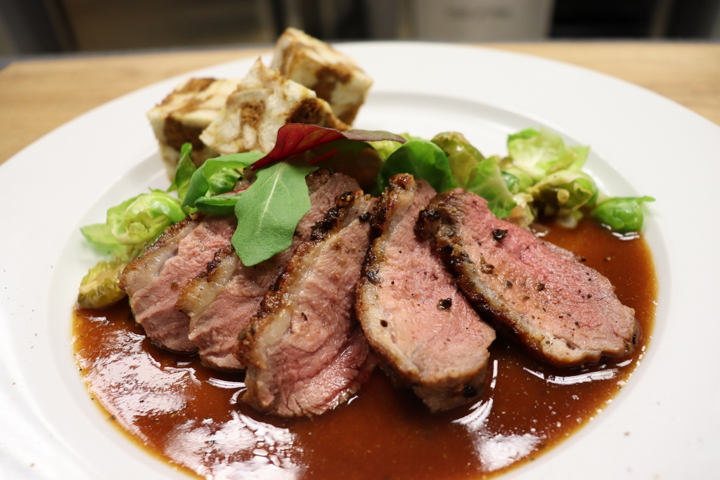 Husí prsa – Nakrájíme kůži a maso naložíme (sůl, pepř, tymián). Rozpálíme si grilovací gastronádobu a husí prsa grilujeme 10 min. Necháme odpočinout 10 min v teple. Filírujeme na tenké plátky.
