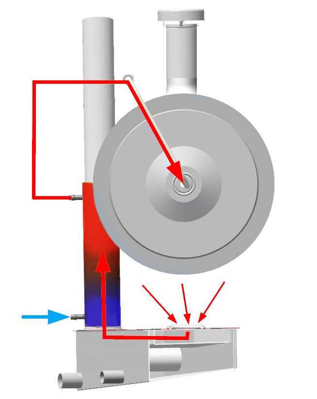 Voda předehřátá v zabudovaném výměníku je vstřikována do speciálního kelímku ve středu patentovaného ventilátoru, kde se dále ohřívá. Díky odstředivé síle protéká optimální množství vody ideálně umístěným otvorem ve stěně kelímku. Téměř vroucí voda je poté rozptýlena rotujícími lopatkami na jemné kapky, které rovnoměrně dopadají na topná tělesa a mění se téměř okamžitě v čerstvou páru.