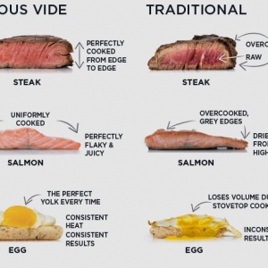 Pokud platí stará řeznická poučka, že největším nepřítelem masa je mrazák a horká trouba, pak přístroj, s jehož pomocí se potraviny upravují sous-vide, je ideálním řešením. Při nízké teplotě se zavakuované táhnou ve vodní lázni i dlouhé hodiny. „Základem je zvolit správnou surovinu a hlavně čas a teplotu. Masa by měla být předem opečená, než je dáme do vakuovacích sáčků, aby se uvnitř zachovala šťáva. Ta jinak vyteče a veškerá chuť a síla v mase se ztratí,“ radí šéfkuchař Jaroslav Sapík s tím, že on sám metodou sous-vide nejraději připravuje kachní prsíčka podávaná nastudeno, kuřecí galantinu či tuňáka.