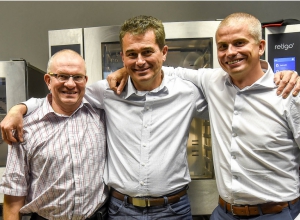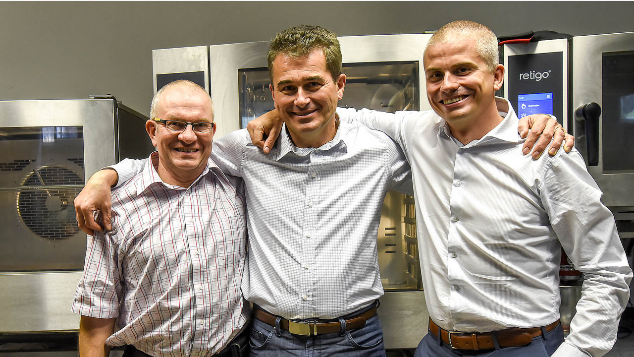 Za úspěchem společnosti Retigo, která vyrábí multifunkční trouby pro restaurace, obchodní řetězce či jídelny, stojí také férový a lidský přístup. Zleva spoluzakladatelé firmy Libor Pavelka a Jaroslav Kudela, vpravo výkonný ředitel Norbert Pelc. Autor: HN – Petr Dohnal