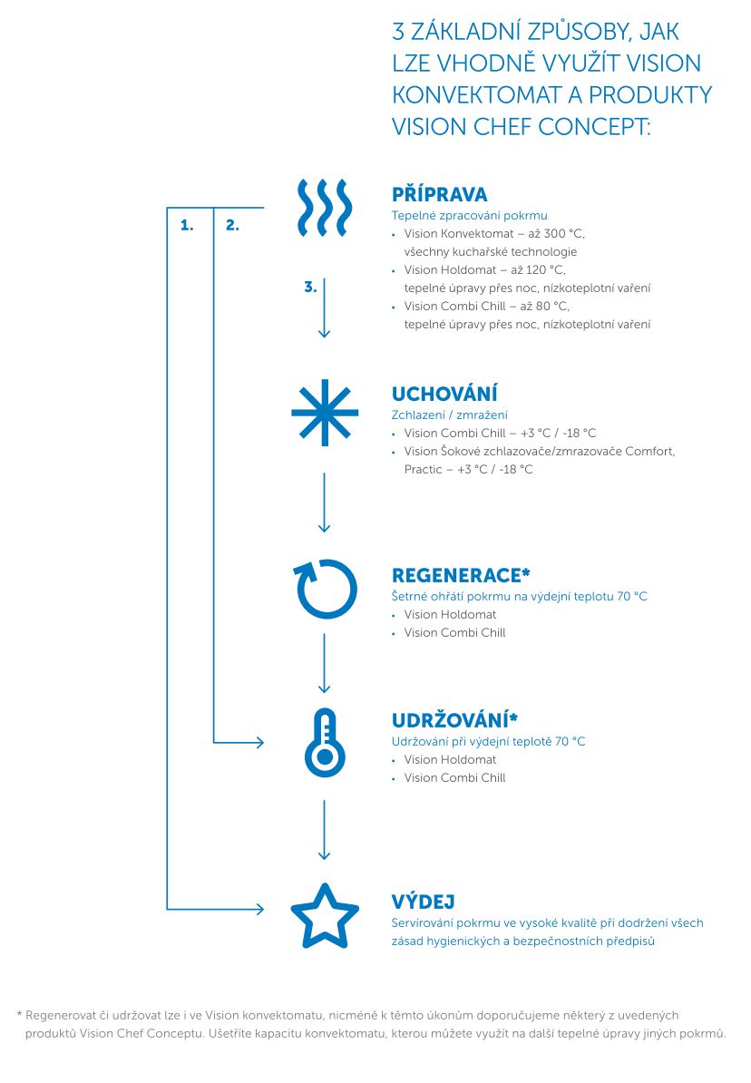 Pokud přemýšlíte koncepčně, víte, co děláte. V gastronomii je příprava základem úspěchu. Vhodnou kombinací Vision konvektomatu a jednotlivých prvků Vision Chef Conceptu lze pokrýt všechny hlavní činnosti v profesionální kuchyni – vaření, udržování, šokové zchlazování/zmrazování a regeneraci a připravit se tak na bezproblémový a rychlý výdej pokrmů bez stresu a ztráty kvality.