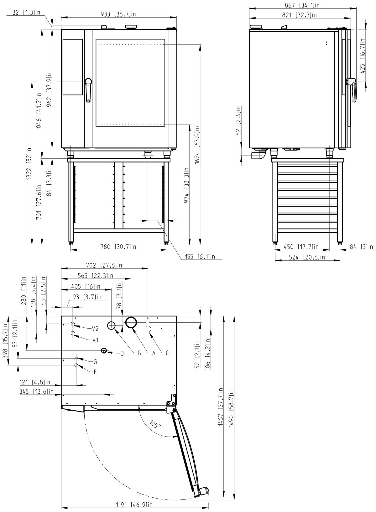 A - Klapka | B - Komínek | C - Odpad | D - Odvod spalin | E - Elektřina | G - Plyn | V1 - Neupravená voda | V2 - Upravená voda