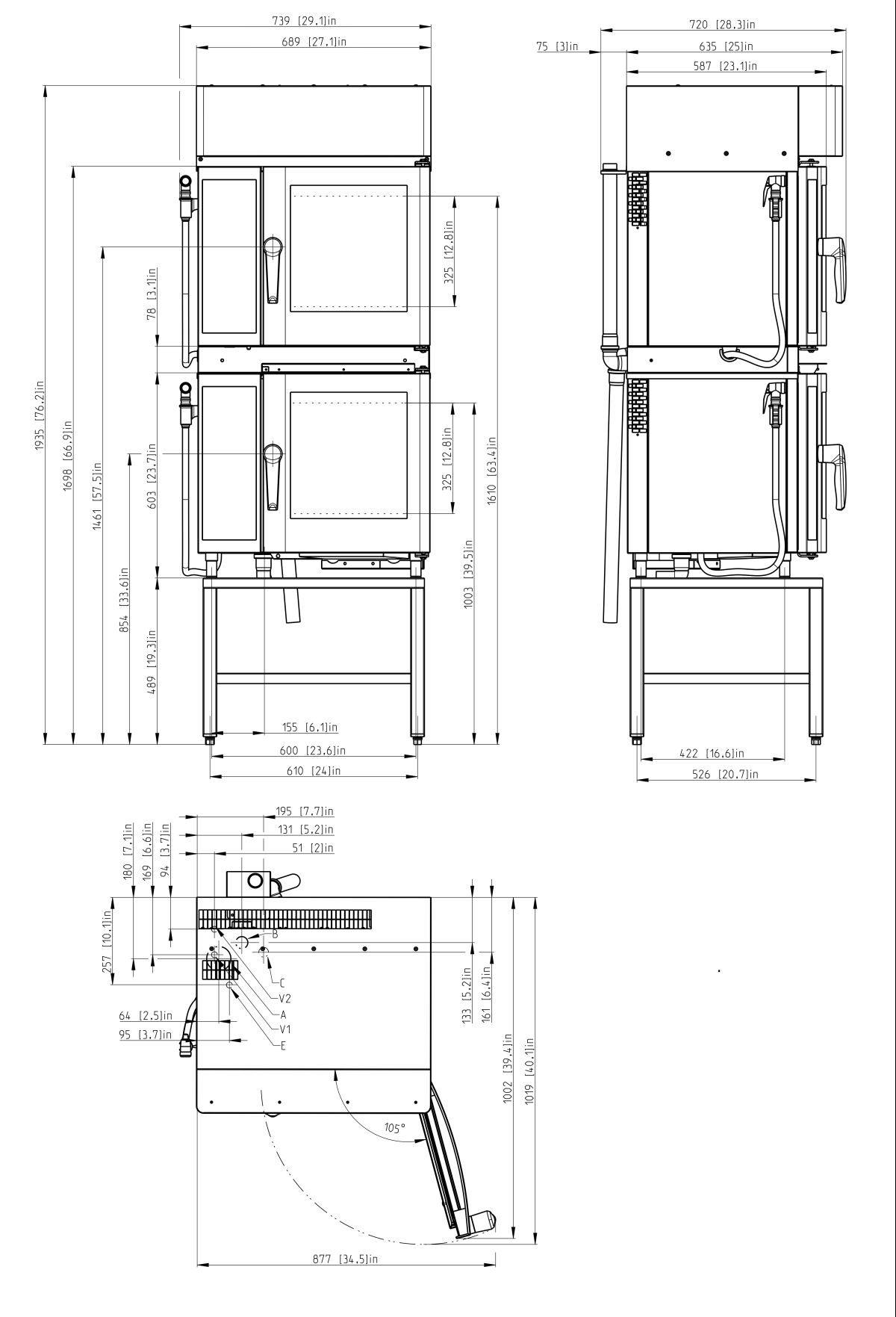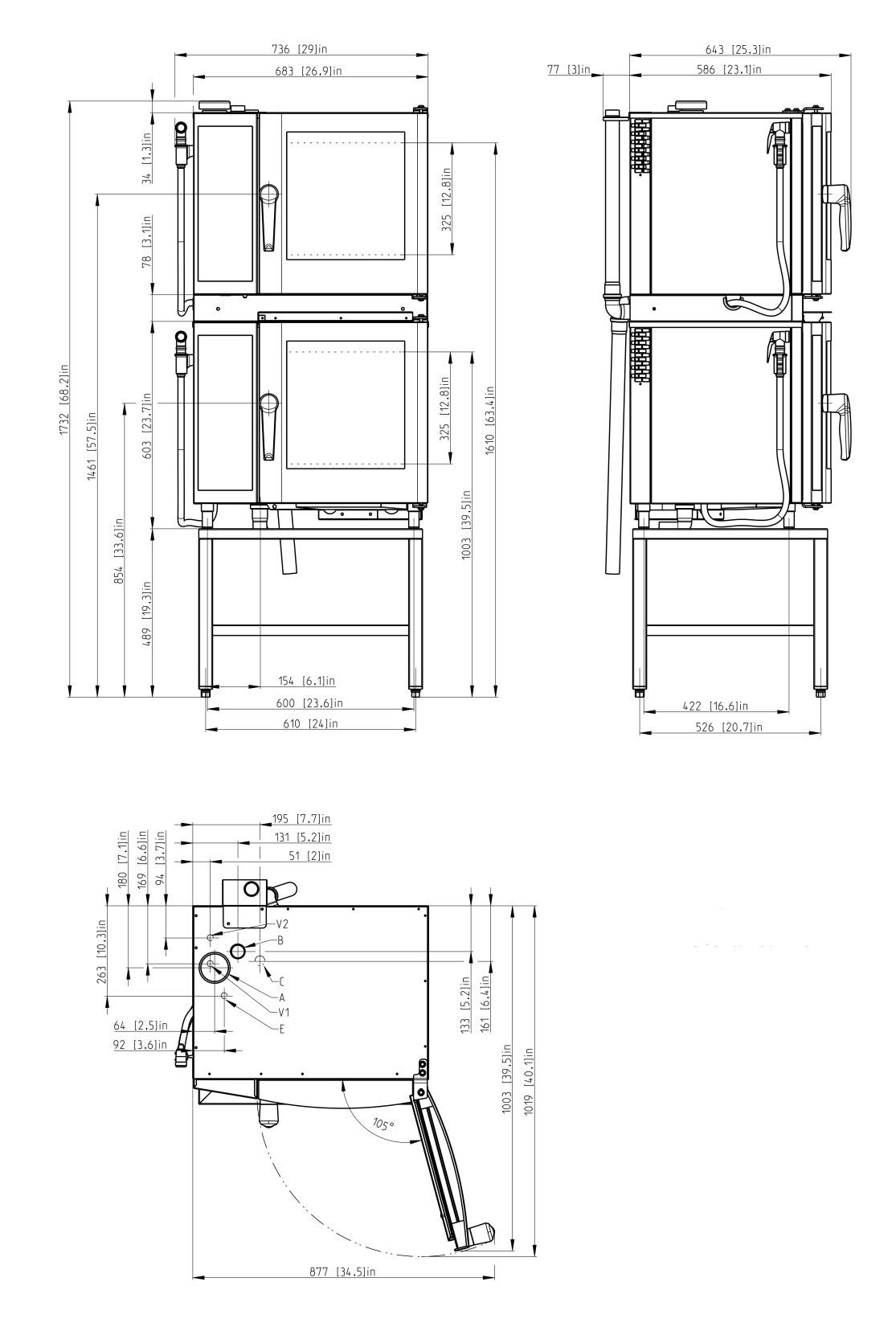 A - Klapka | B - Komínek | C - Odpad | E - Elektřina | V1 - Neupravená voda | V2 - Upravená voda