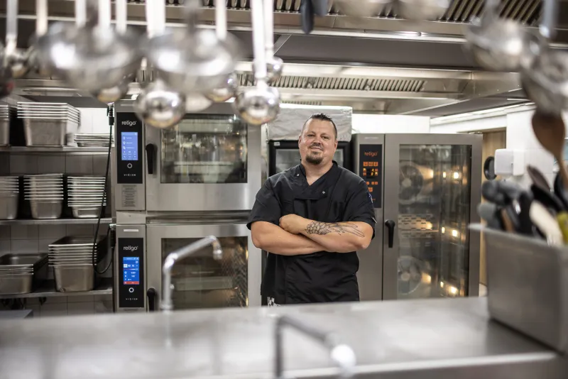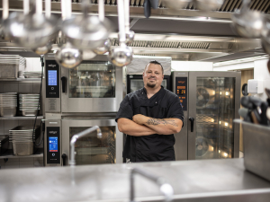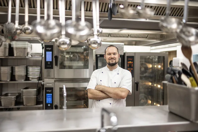 ► V naší restauraci připravujeme zejména snídaně a večeře, obědy jsou jen doplňkové á la carte. Hostům nabízíme vždy 6 druhů jídel, pokud je plná kapacita hotelu, může to být až 1000 porcí denně. Využíváme nejvíce sous-vide vaření a ruční režim, protože tak si upravíme programy podle sebe. Výborné jsou snídaňové programy, vaříme volská oka, omelety a další. Konvektomaty usnadňují práci, dá se v nich upéct i celé prase, rýže se nerozvaří.