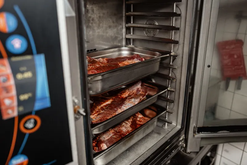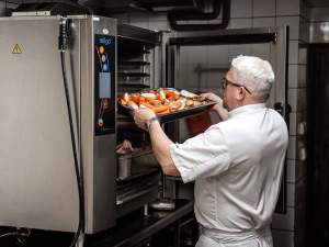 Ten menší máme na regeneraci na výdeji. Děláme v něm knedlíky či vejce na kulajdu. Ve velkém konvektomatu využíváme především program na pečení přes noc. Dáme tam 40 kg žeber a přes noc se pěkně pomalu pečou. Nahoře v peci pečeme housky, chleba a sušíme si ovoce a zeleninu.