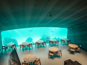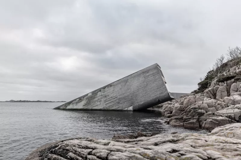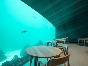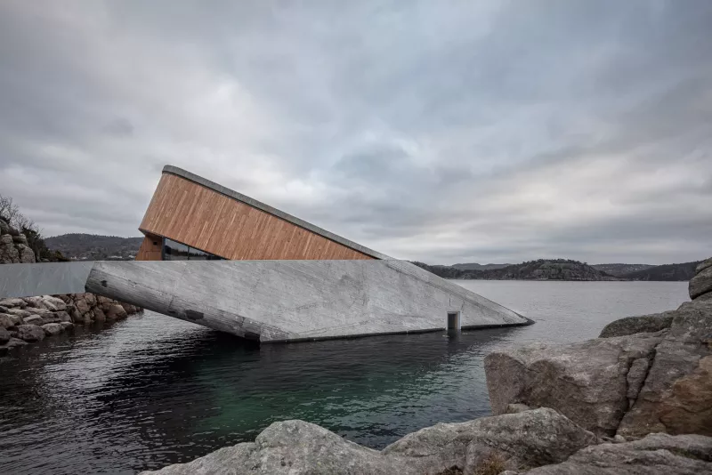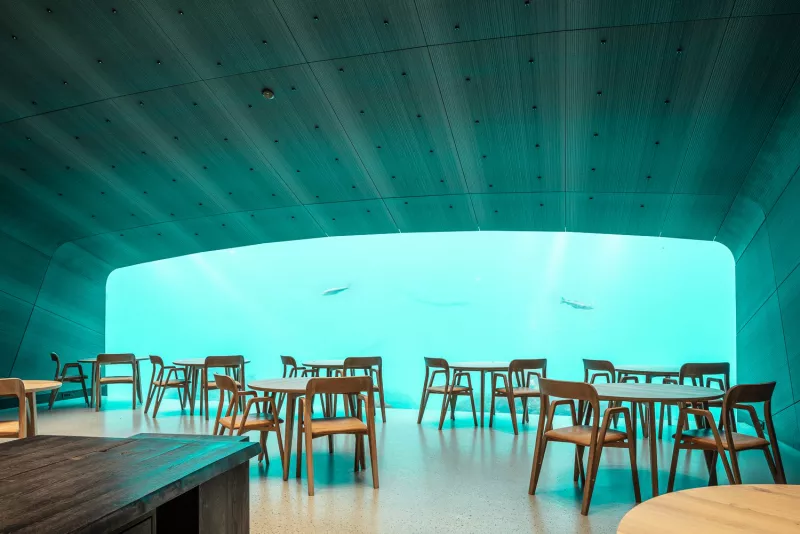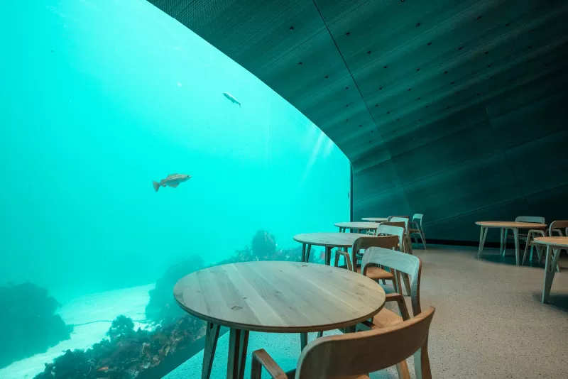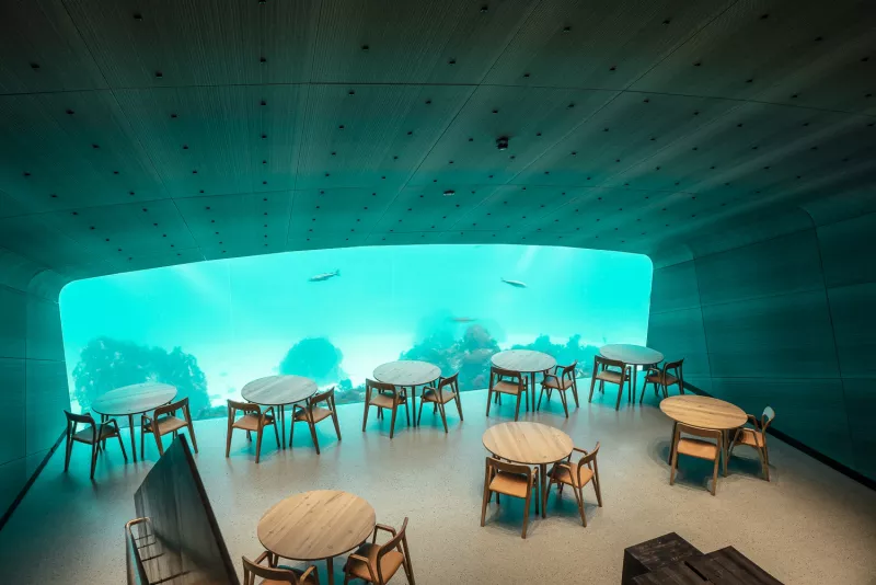 Restaurace z poloviny zapuštěná do ledové vody Lindesnes vás zve k večeři pět metrů pod hladinou. Panoramatický výhled na mořské dno nabízí vizuální bránu do moře a spojuje hosty s mořskou divočinou. To vám dává příležitost vidět jinak zřídka spatřený mořský ekosystém v severním Atlantiku. Ve spolupráci se Snøhettou a několika zkušenými místními norskými partnery majitelé vyvinuli restauraci se zaměřením na mořský výzkum, architekturu a gastronomii.